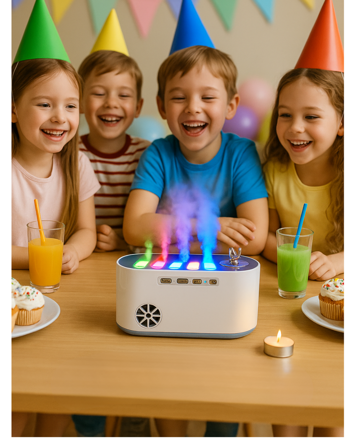đ„łDer Diffusor erzeugt intensiven bunten Nebel und eine faszinierende Lichtshow, die Kinder begeistert.